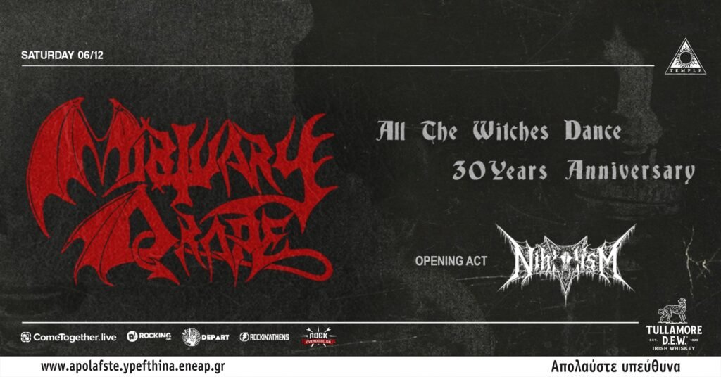 Οι Mortuary Drape επιστρέφουν στην Αθήνα για μια βραδιά που θα μείνει αξέχαστη. Στις 6 Δεκεμβρίου, το Black Temple θα υποδεχθεί τους Ιταλούς πρωτοπόρους του ritual/occult black metal για μια μοναδική εμφάνιση, αφιερωμένη στα 30 χρόνια του cult έπους “All the Witches Dance“. Το συγκρότημα θα παρουσιάσει ολόκληρο το εμβληματικό ντεμπούτο του, προσφέροντας ένα set διάρκειας ενενήντα λεπτών – μια τελετουργική εμπειρία που ξεπερνά τα όρια μιας απλής συναυλίας.