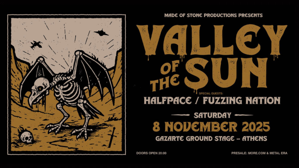 Η Made of Stone Productions παρουσιάζει τους Valley of the Sun από τις ΗΠΑ, μαζί με τους Halfpace και Fuzzing Nation από την Ελλάδα, το Σάββατο 8 Νοεμβρίου 2025 στο Gazarte Ground Stage στην Αθήνα. Τα εισιτήρια διατίθενται σε προπώληση στα 20€ και στην είσοδο του χώρου στα 23€. Η ηλεκτρονική προπώληση πραγματοποιείται μέσω της more.com και του δικτύου της, ενώ έντυπα εισιτήρια θα διατίθενται στο Metal Era (Εμ. Μπενάκη 22, Αθήνα). Οι πόρτες ανοίγουν στις 20:00.