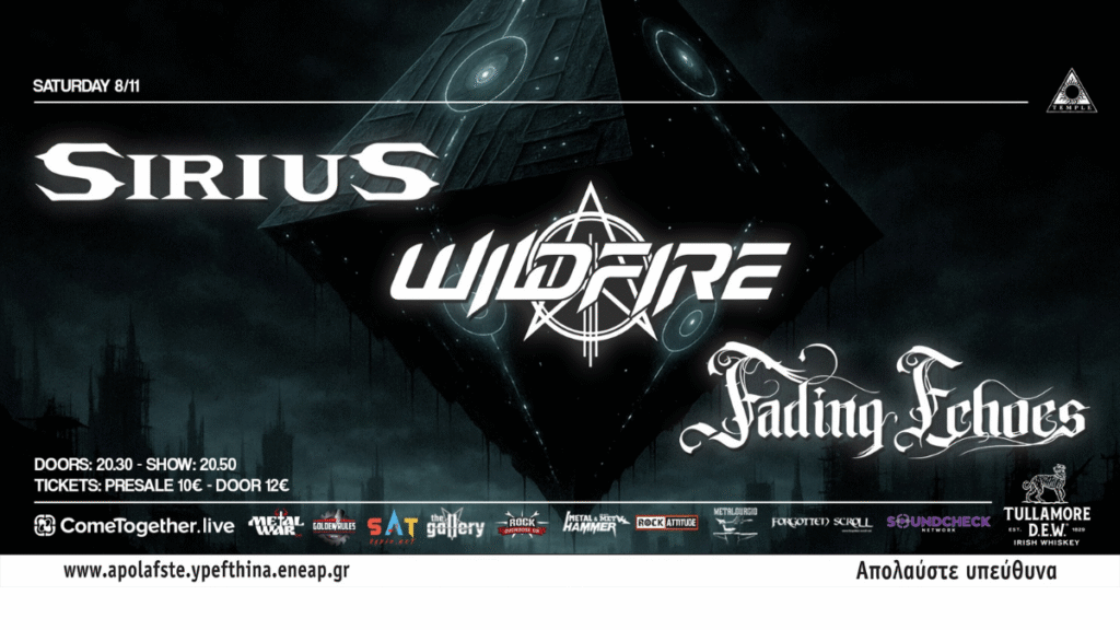 Το Temple Athens ετοιμάζεται να υποδεχτεί μια βραδιά γεμάτη δυναμισμό, ένταση και προοδευτικούς ήχους. Το Σάββατο 8 Νοεμβρίου 2025, τρεις μπάντες της ελληνικής heavy metal σκηνής ενώνουν τις δυνάμεις τους για ένα show που αναμένεται να μείνει αξέχαστο: Sirius, Wildfire και Fading Echoes.