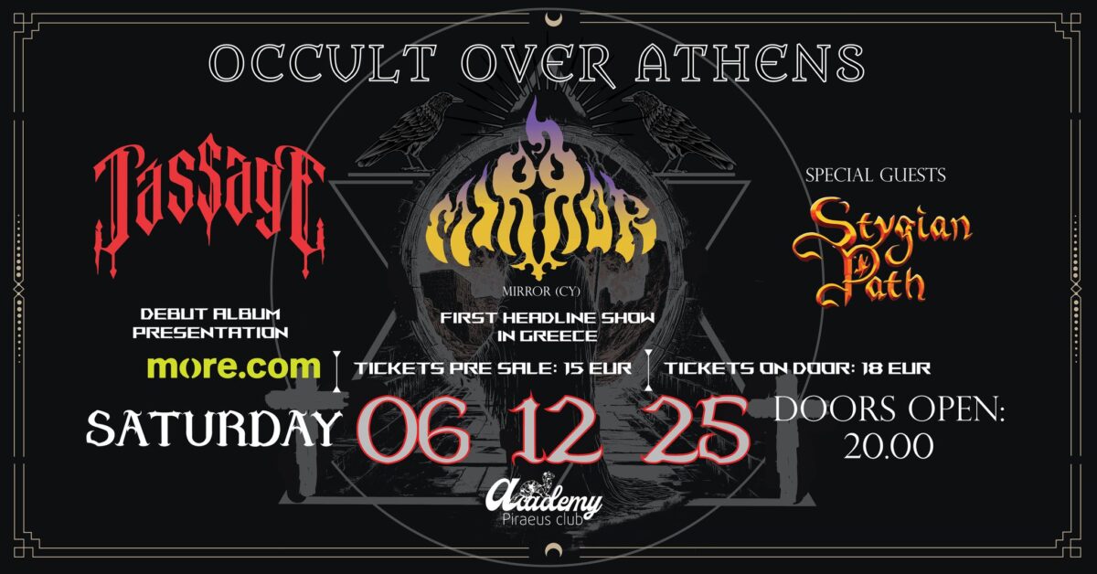 Οι Passage είναι ένα occult heavy metal συγκρότημα από την Αθήνα, που σχηματίστηκε το 2022. Το ύφος τους χαρακτηρίζεται από σκοτεινή θεατρικότητα, ατμοσφαιρικές παραγωγές και στιχουργική που εξερευνά τον μυστικισμό, την υπαρξιακή αγωνία και το οριακό σημείο μεταξύ αποκάλυψης και ενδοσκόπησης. Με επιρροές από Mercyful Fate, Satan, Iron Maiden και Candlemass, ο ήχος τους παραμένει πιστός στη μεταλλική παράδοση, αλλά ταυτόχρονα χτίζει προσωπική ταυτότητα με έντονη μελωδικότητα και δραματικές κορυφώσεις.
