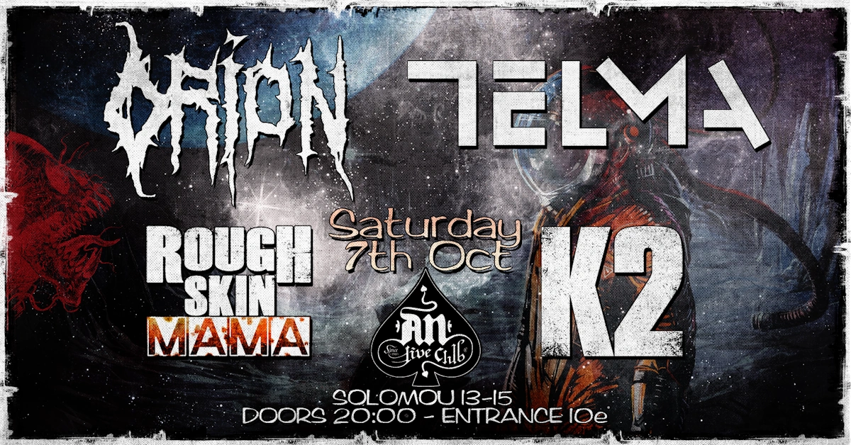 Ένα εκρηκτικό μείγμα από μπάντες της νέας γενιάς, τους ORION, Telma, K2 & Rough Skin Mama που θα μας ξεσηκώσει και θα μας γκρουβάρει χαρίζοντας μας μια heavy rock και & groove metal βραδιά!