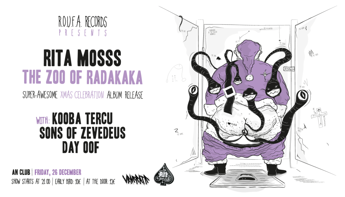 Η παγκοσμίου φήμης R.O.U.F.A. Records ενώνει δυνάμεις με την ιστορική Venerate Industries για να παρουσιάσουν ένα από τα πιο εκρηκτικά live της χρονιάς. Την Παρασκευή 26 Δεκεμβρίου, στη σκηνή ανεβαίνει το The Zoo of Radakaka – A Rita Mosss Super-Awesome XMAS Celebration, μια εορταστική και απόλυτα απελευθερωμένη εμφάνιση που σηματοδοτεί και την παρουσίαση του νέου άλμπουμ των Rita Mosss. Μαζί τους, μια τριάδα σχημάτων της εγχώριας underground σκηνής: Kooba Tercu, Sons of Zevedeus και Day Oof.